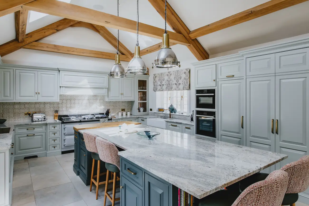 This kitchen was part of a large barn conversion in Oxton, The client wanted a traditional style kitchen with a lot of detail, and some modern features like the Bora downdraft hob and quooker hot water tap, They wanted a large island unit to fill the room so we added a curved unit on the end with a Oak butchers block top which complimented the Oak A framed beams